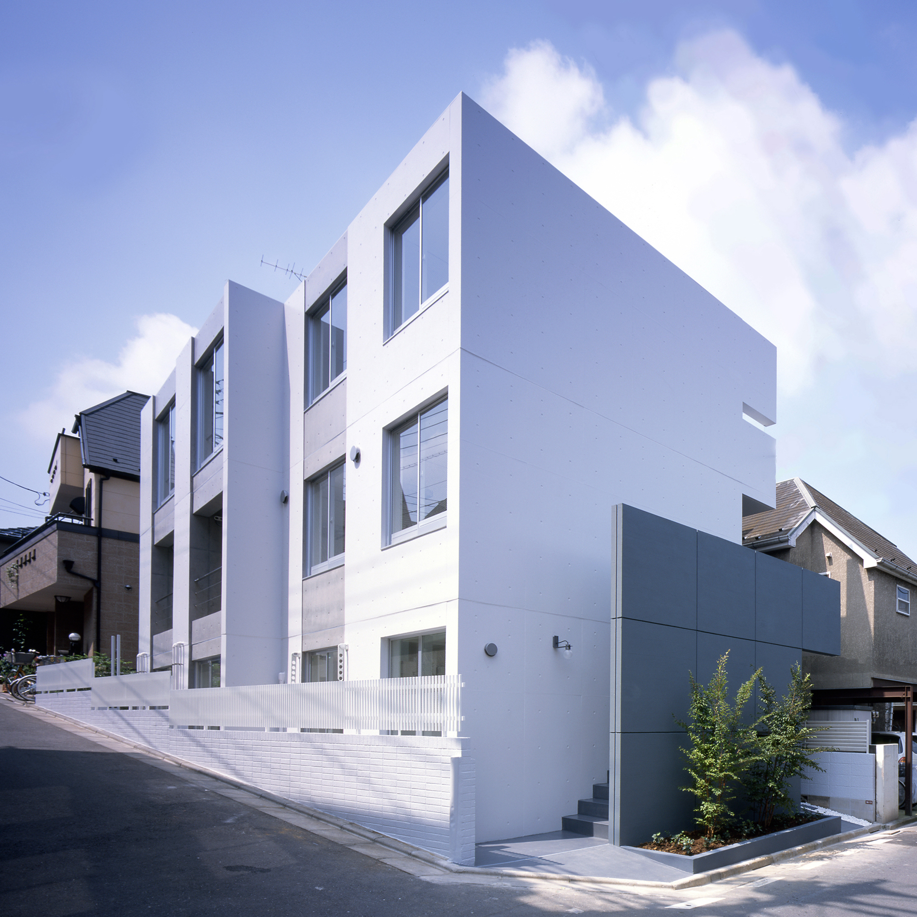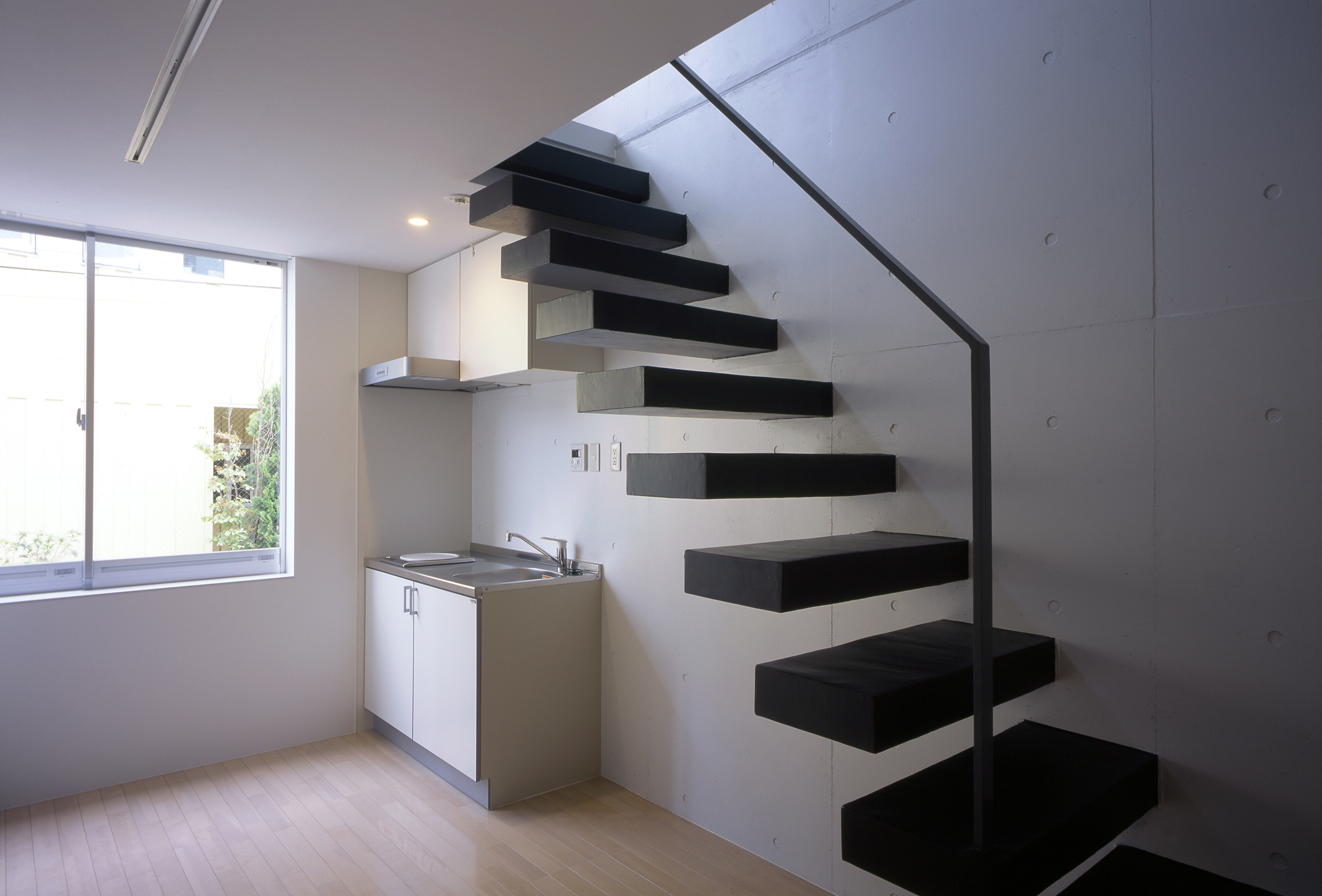 様々なタイプの部屋を組み合わせた単身者用の7戸の集合住宅。メゾネットを採用し、各階の光環境の均質化を計る。水まわりをガラスで仕切る事で限られた空間に拡がり感を与えた。