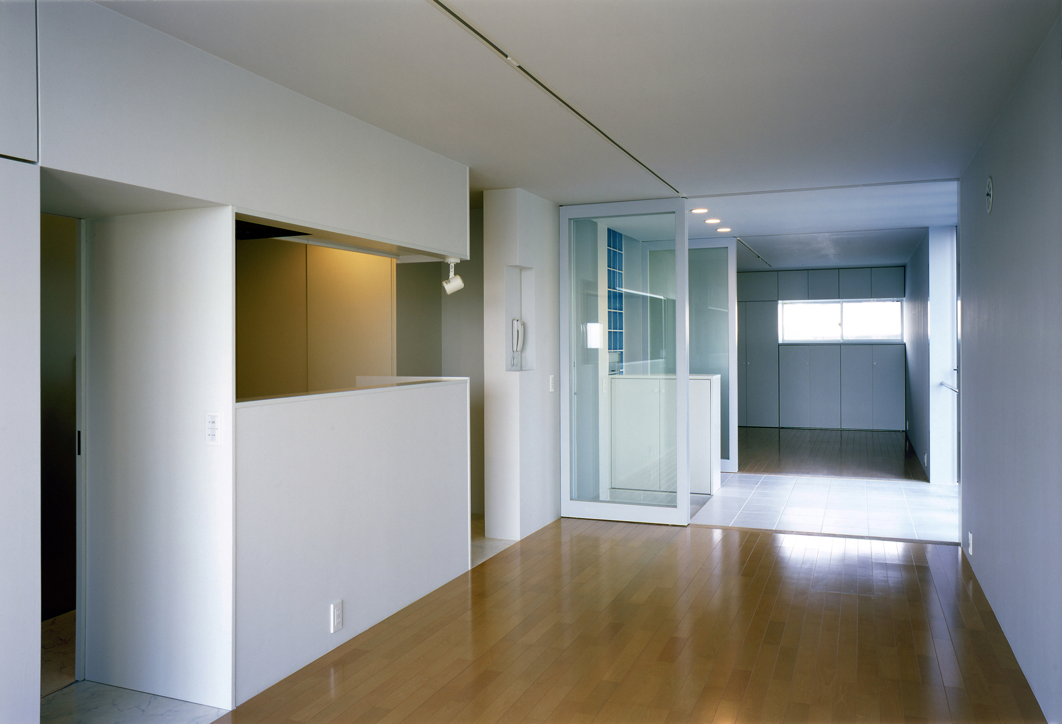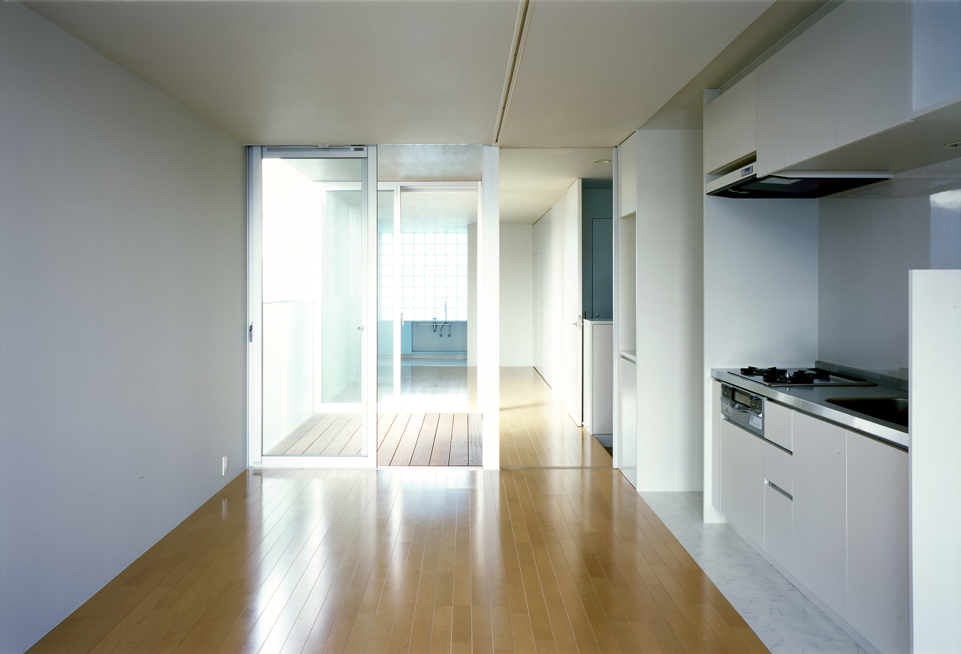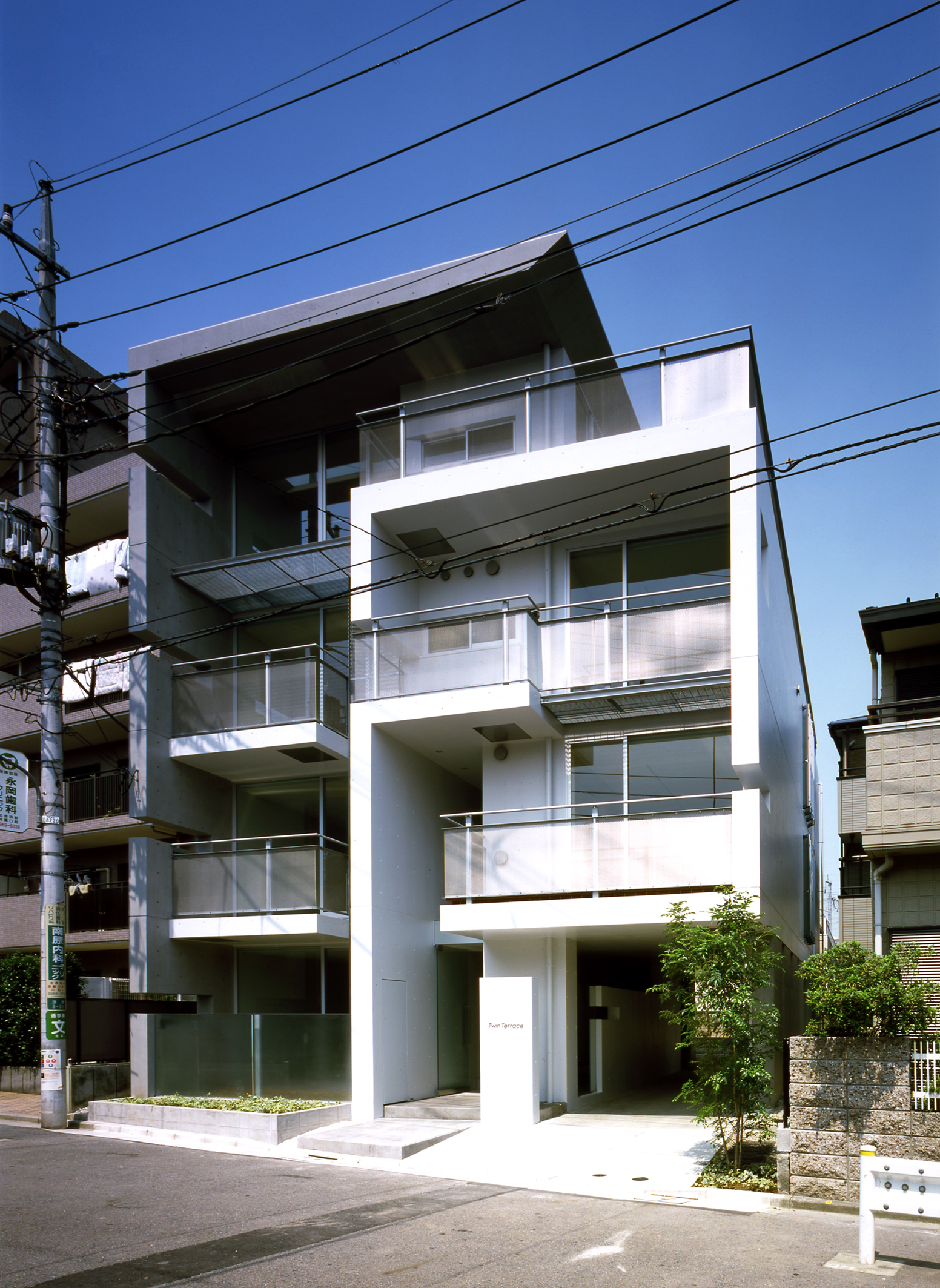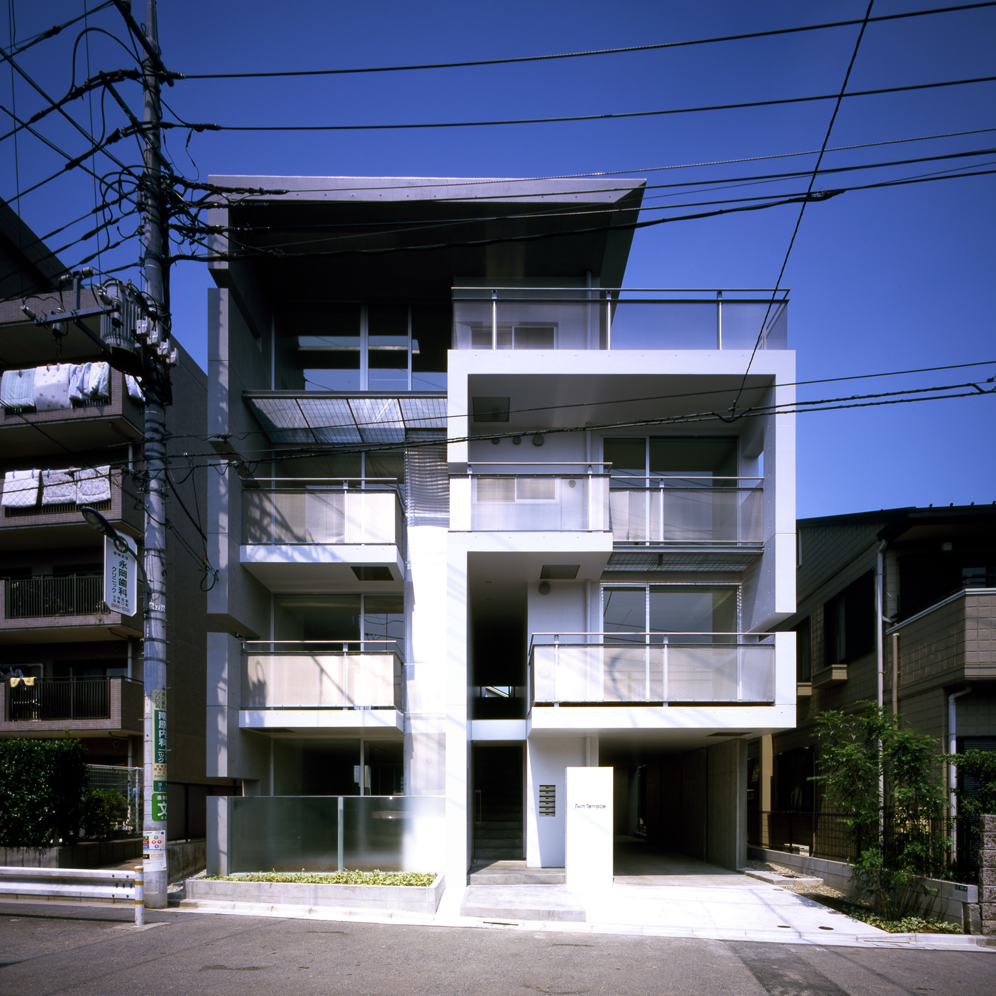 南北に長い敷地に計画した住戸数6戸の集合住宅。各戸を南面させるためにさらに細長く分割した住戸は、階段室のスリットを挟み東西に並ぶ。各戸は中央にプライベートテラスを持つ。