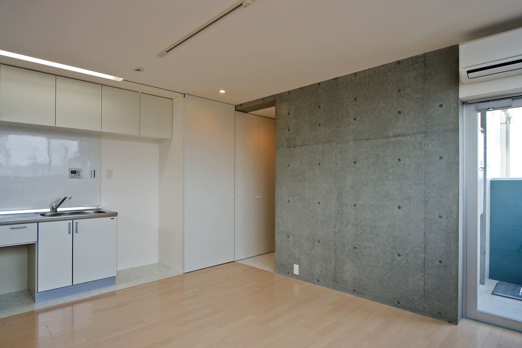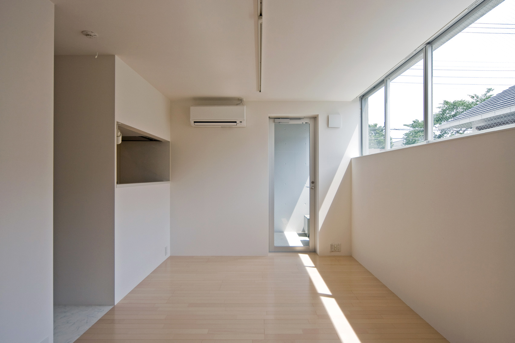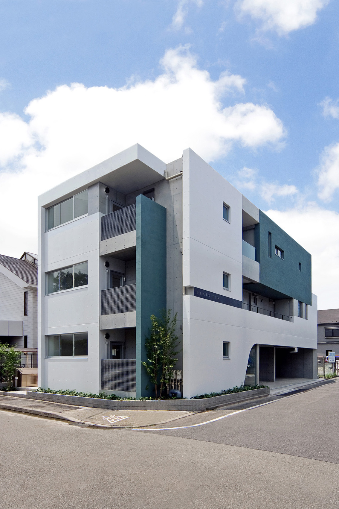 ワンルームとファミリーを組み合わせた7戸の賃貸集合住宅。駐車場と共用廊下の水平開口と積層させて白と緑のボリュームを組み合わせ、外観に抽象絵画のようなコンポジションを構成した。