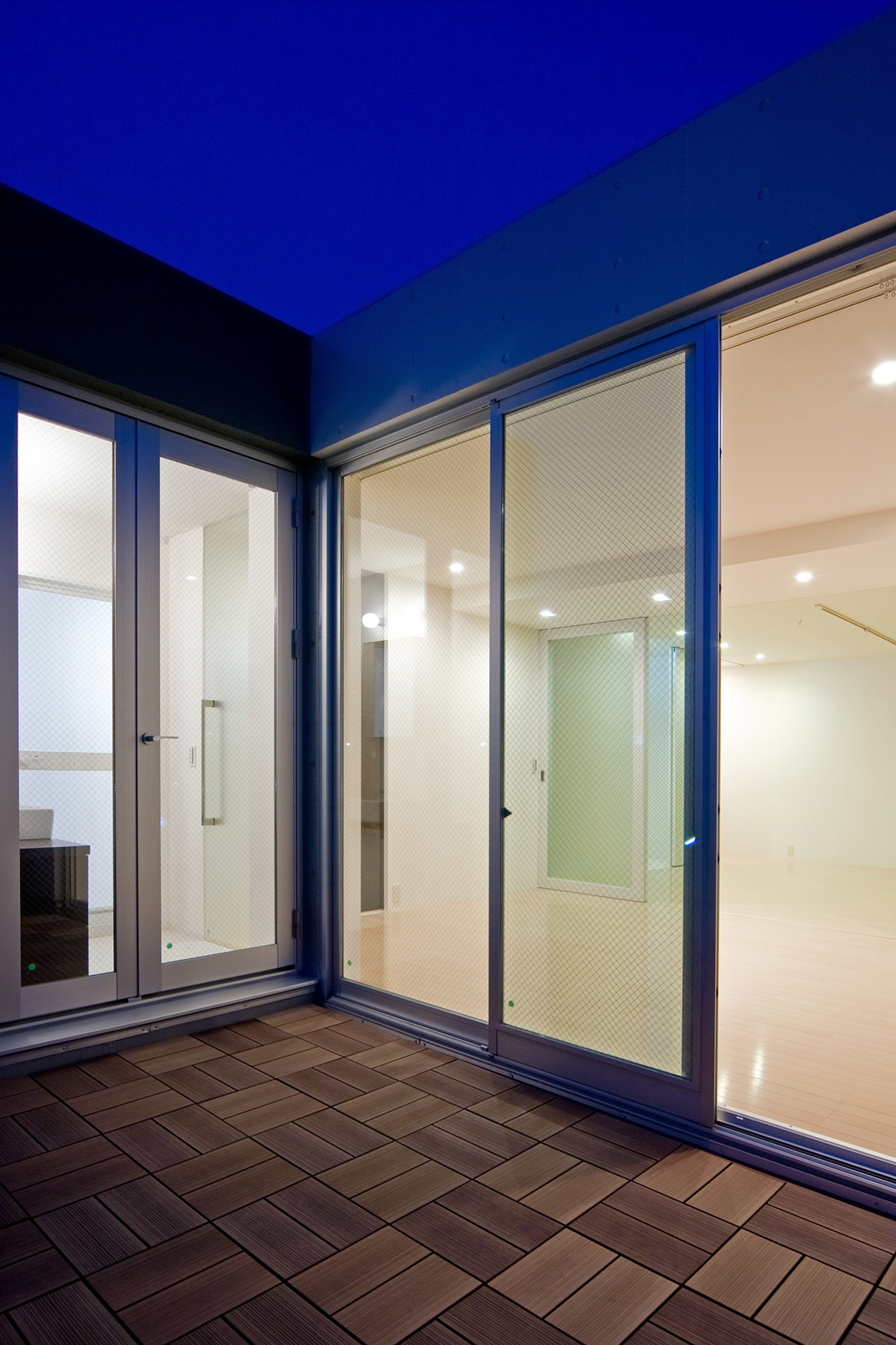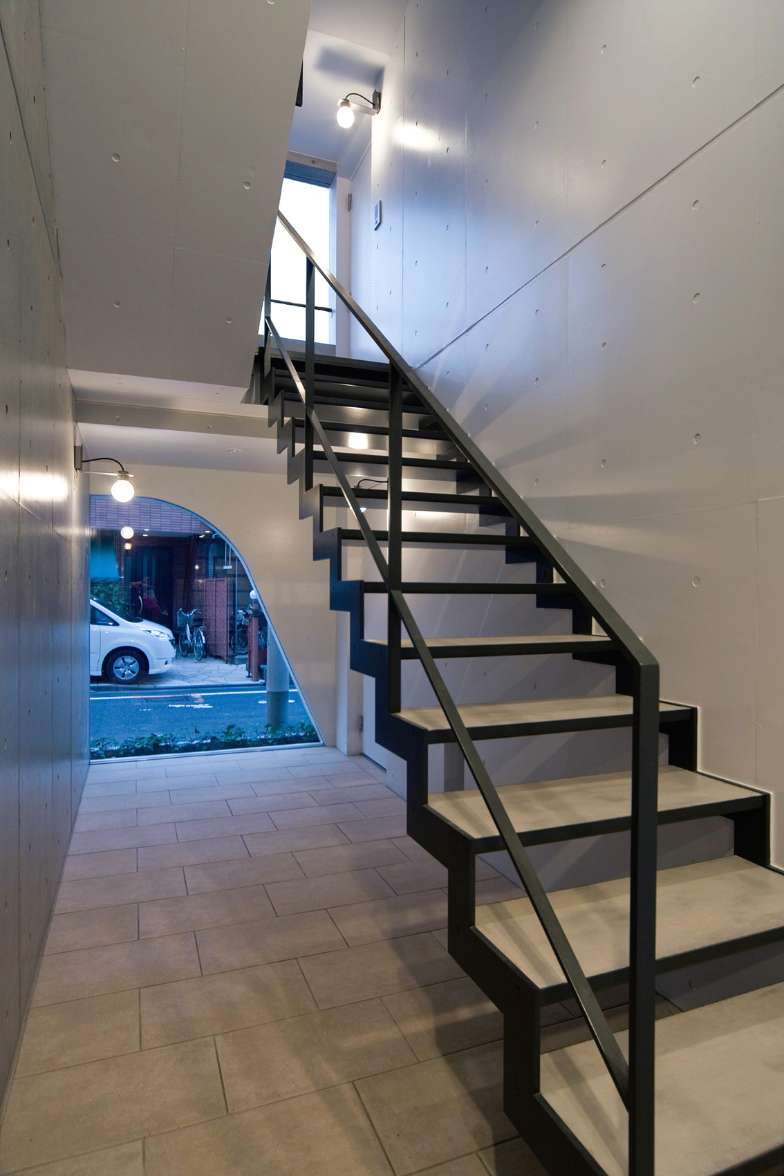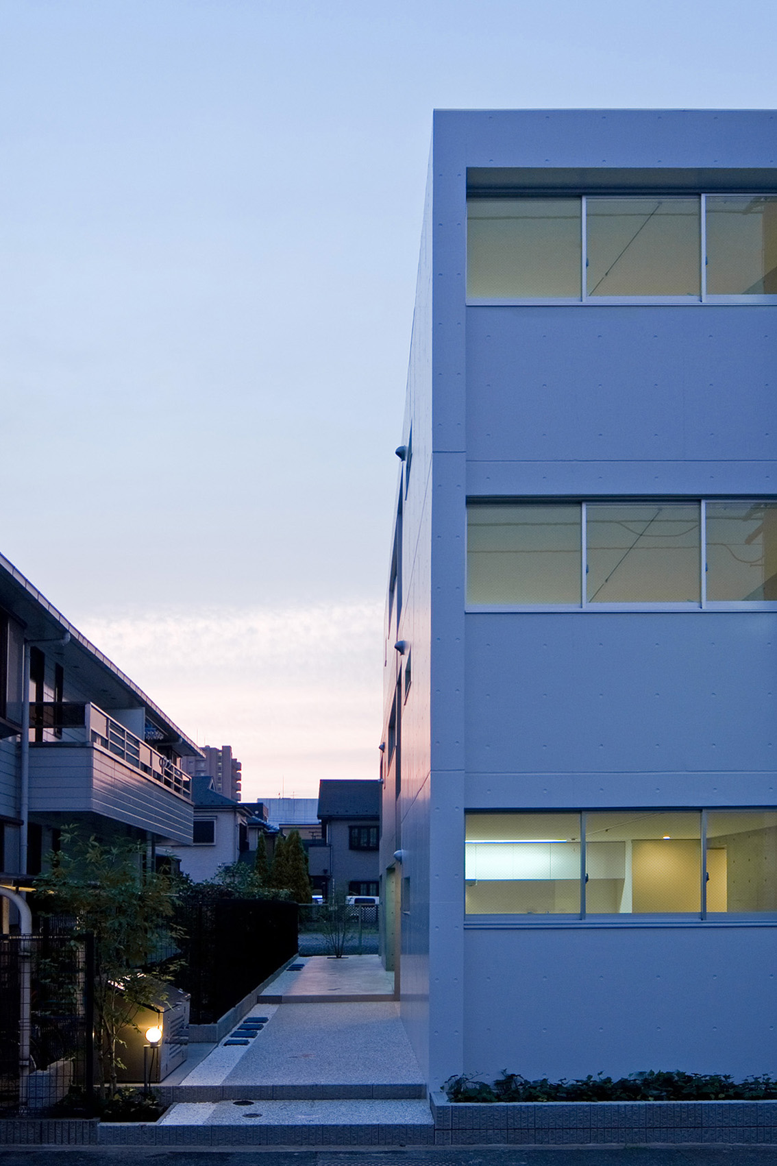ワンルームとファミリーを組み合わせた7戸の賃貸集合住宅。駐車場と共用廊下の水平開口と積層させて白と緑のボリュームを組み合わせ、外観に抽象絵画のようなコンポジションを構成した。