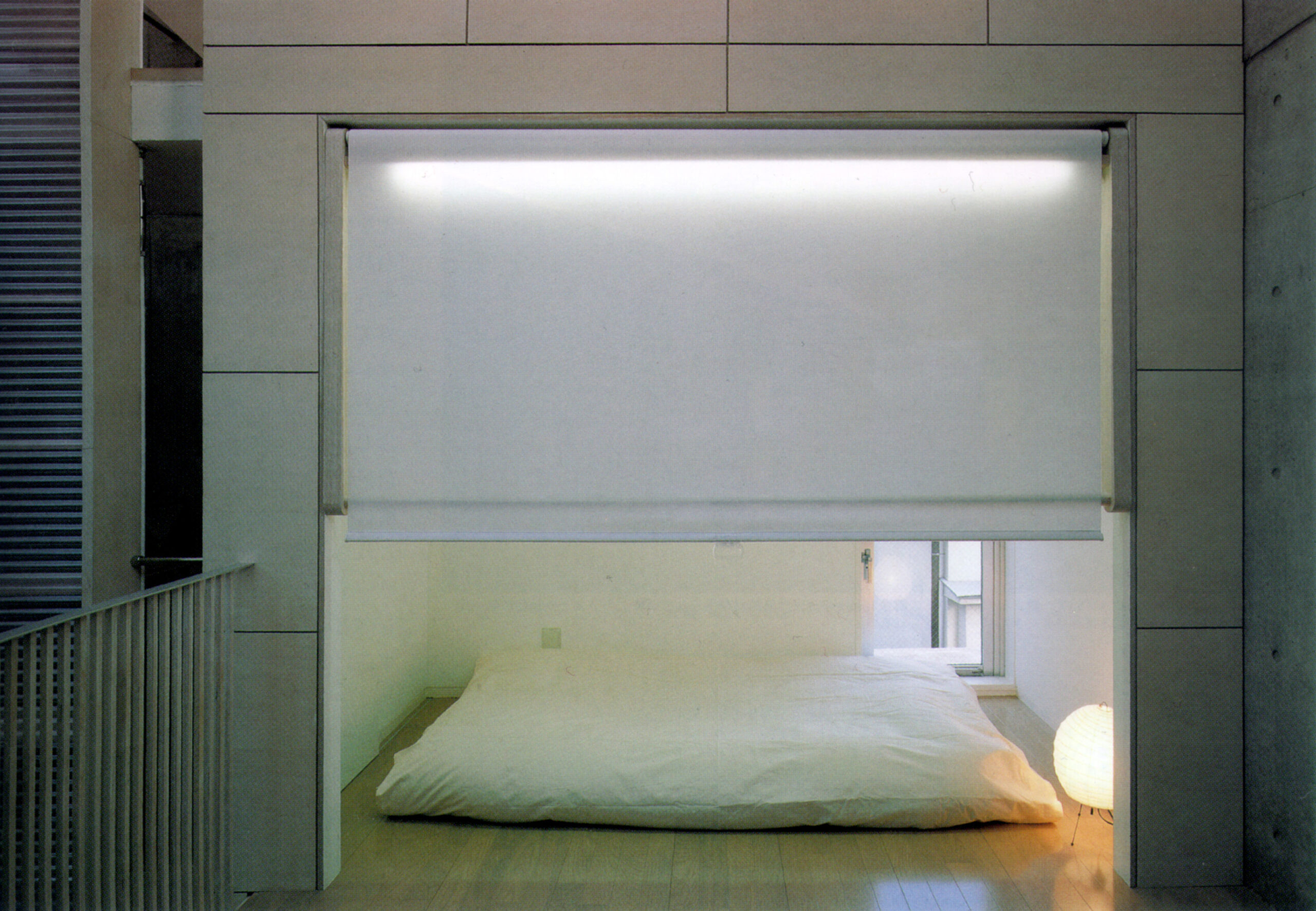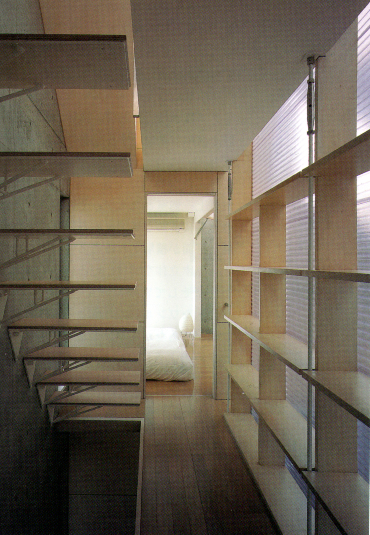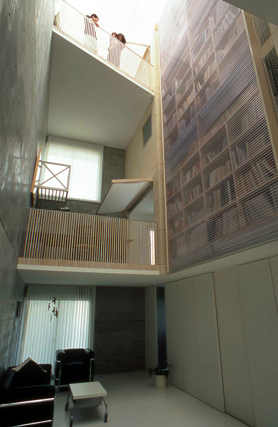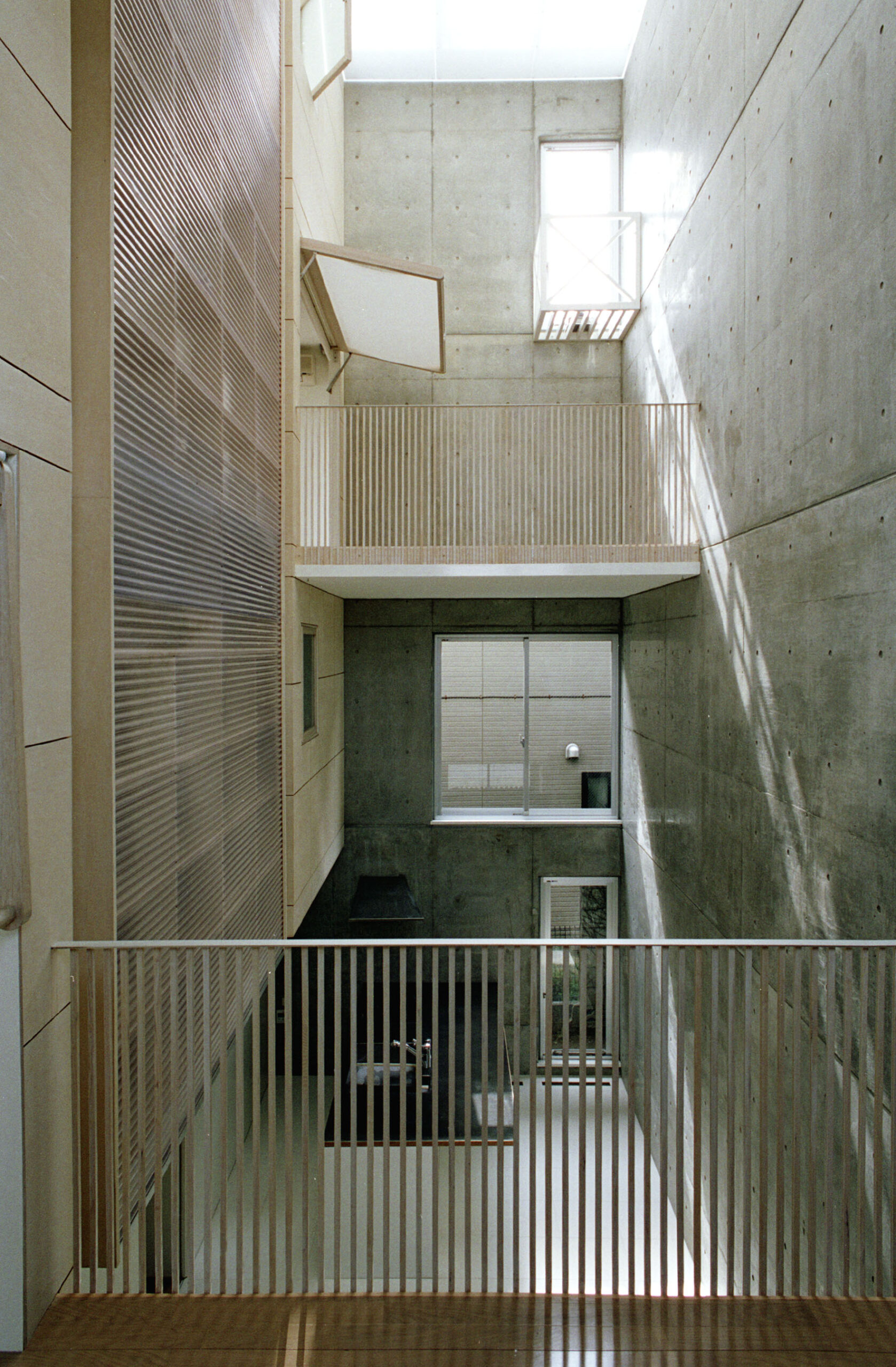 住宅密集地に位置する狭小住宅。天窓から9mの吹抜けを通して1階に自然光を導く。パブリックな空間とプライベートな空間を曖昧に繋ぐ。