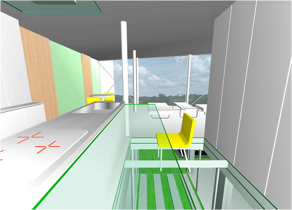 敷地は前面道路が地盤面より2m高い位置にあり、北側に眺望が開けている。1階に採光と通風をどのように確保するかを断面計画で回答した展望ハウス。