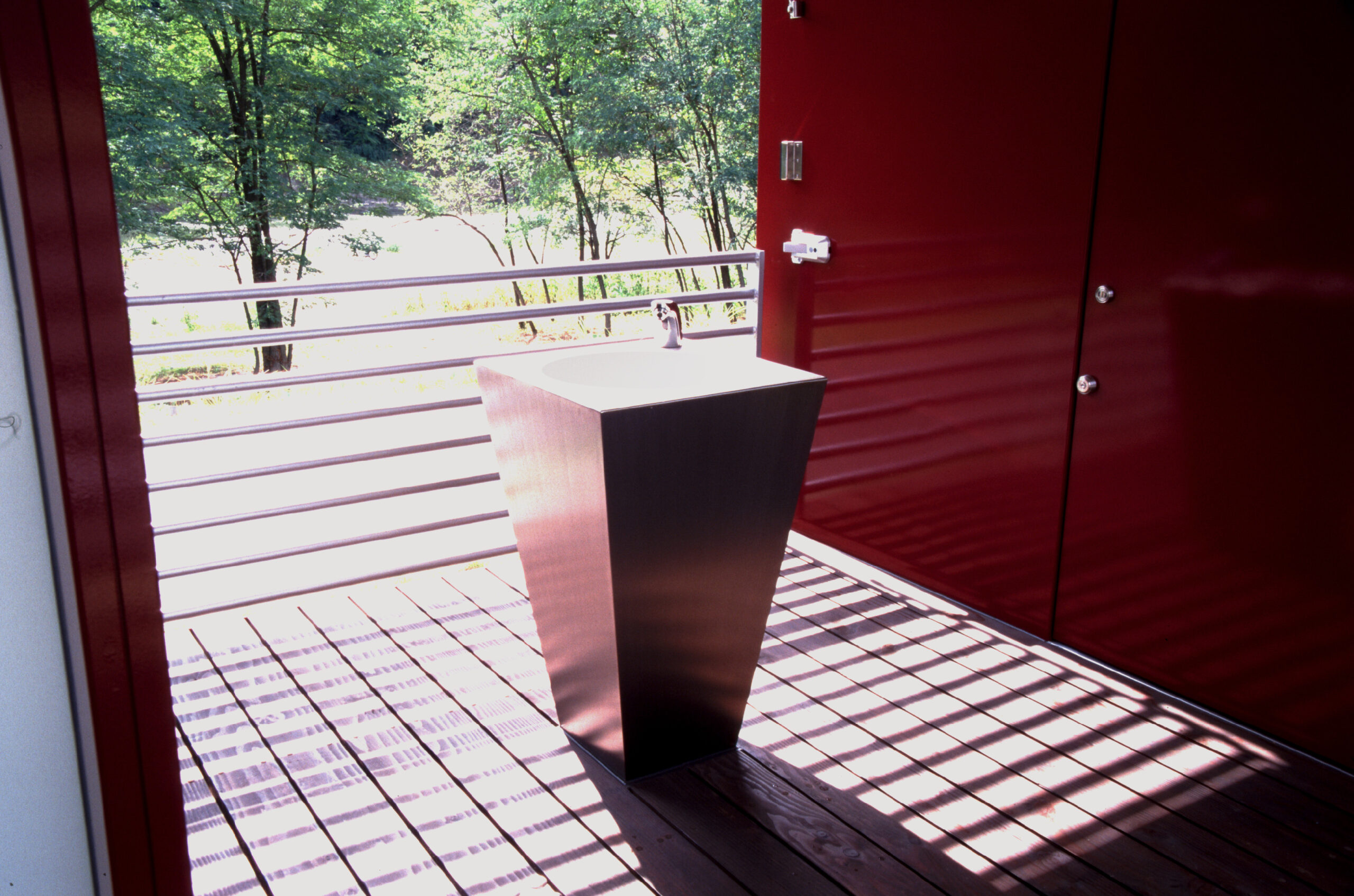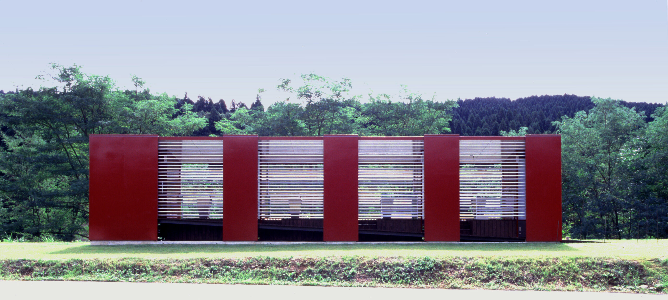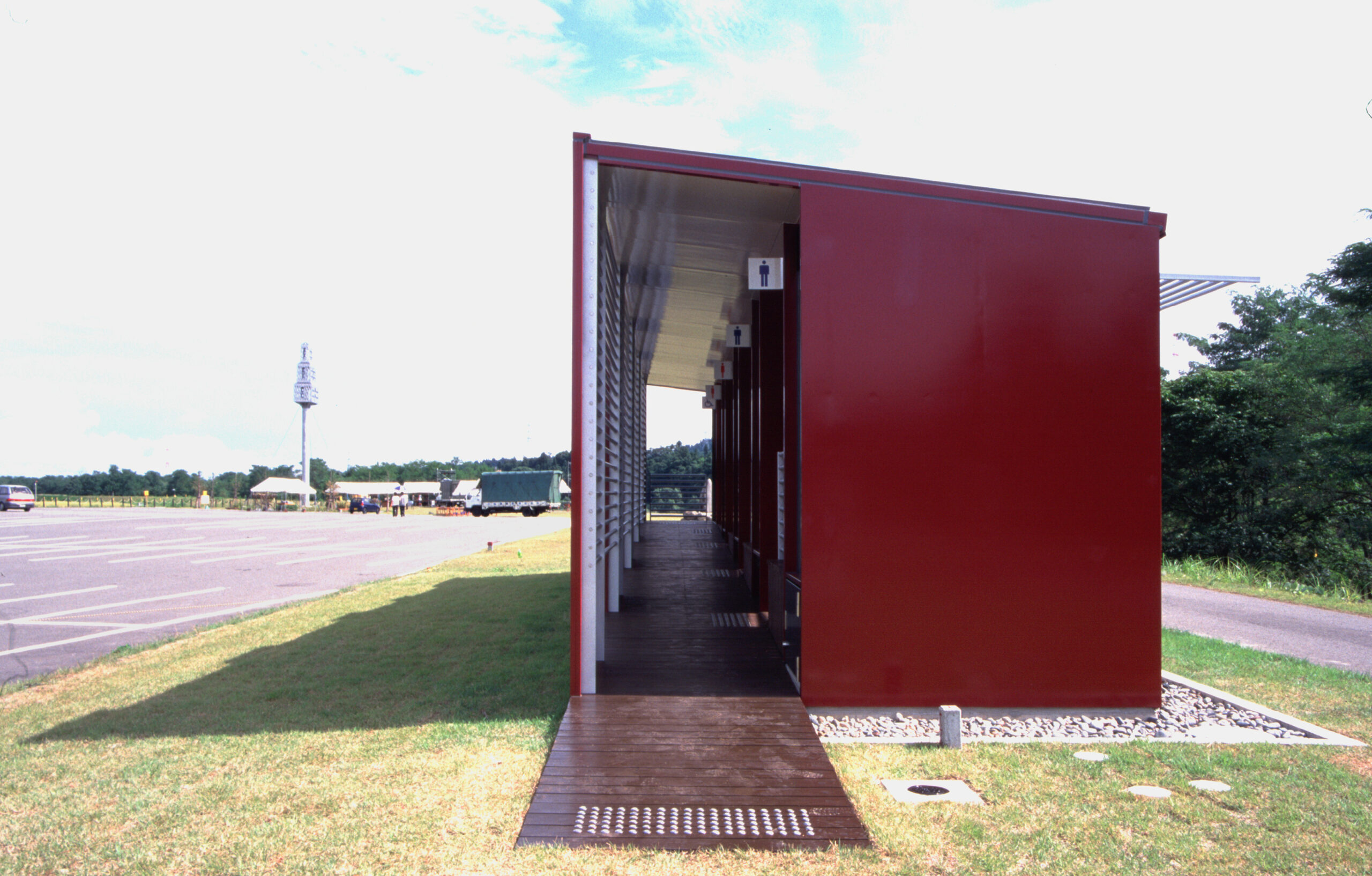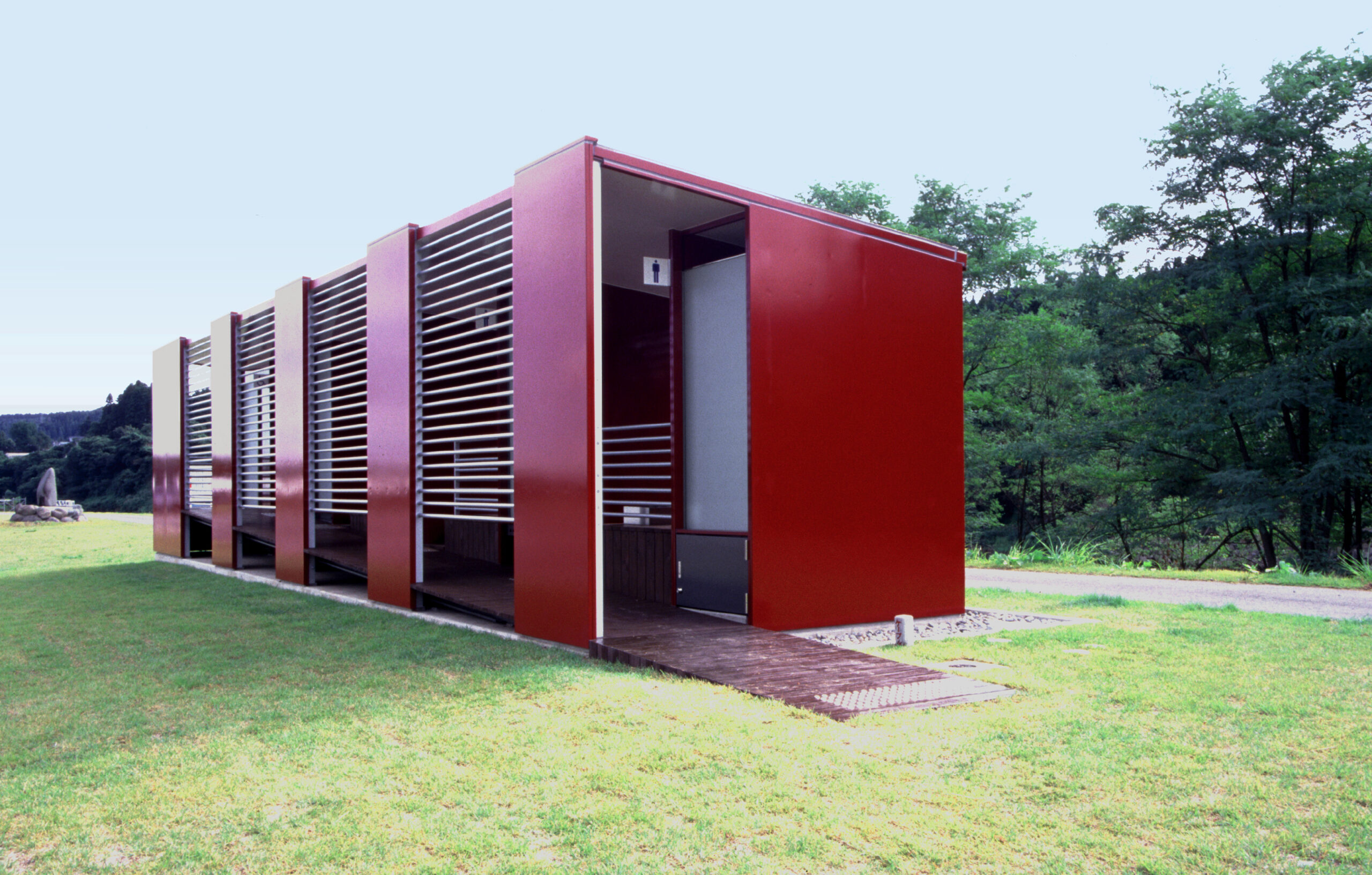 表裏のない開放的な公共トイレ。鋼製複合パネルによる鉄板構造を用い、豪雪にも耐えうる軽快な構造とした。