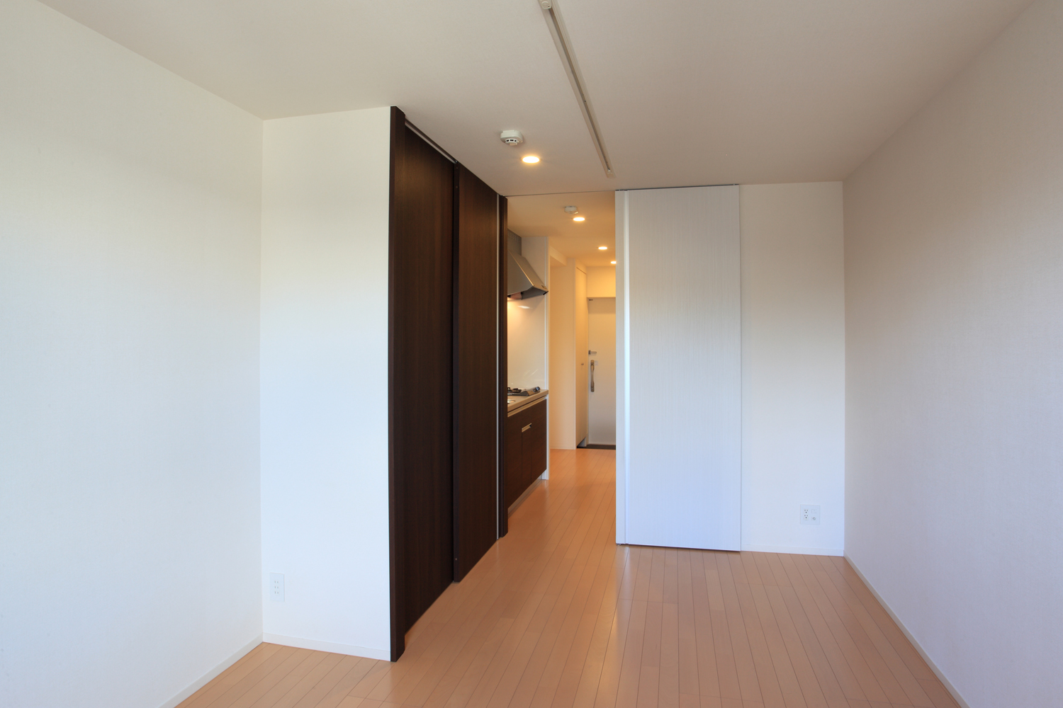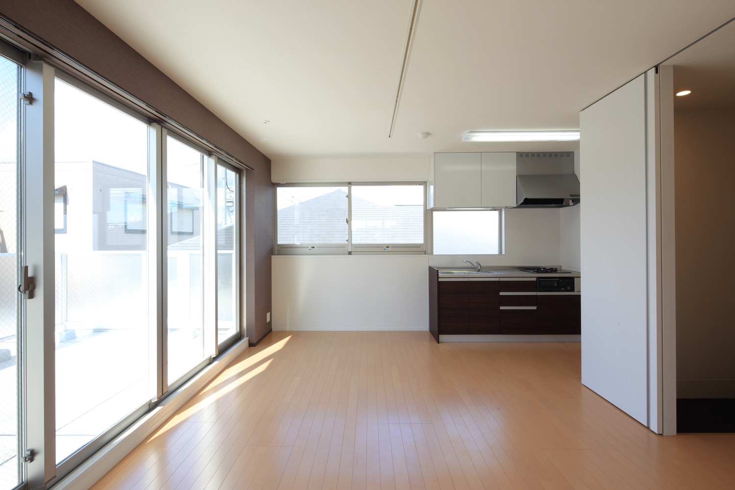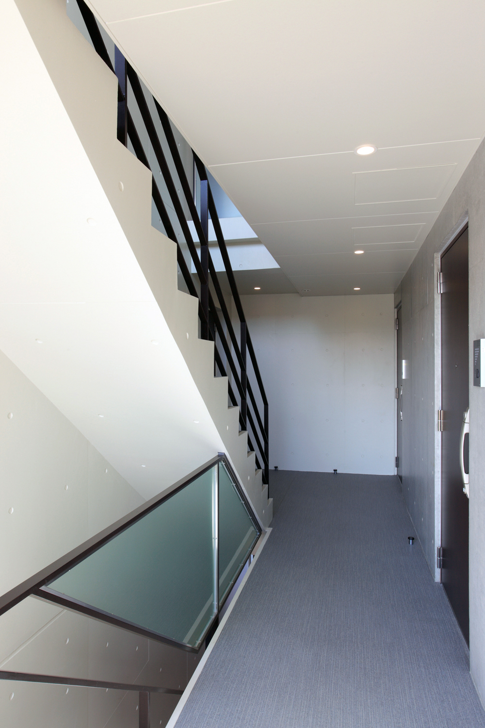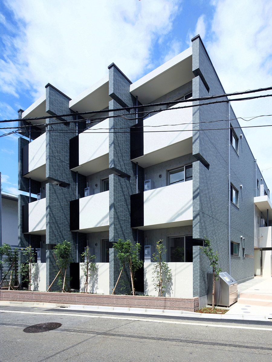 ワンルームとファミリーを組み合わせた14戸の賃貸集合住宅。 採光環境の均質化を図り、道路側に間口の狭いワンルーム住戸を、奥側に間口の広いファミリー住戸を配した。 ファサードは、住戸間の界壁が外部に伸びてバルコニーを構成するシンプルな構成であるが、不整形な敷地形状に合わせて雁行させたことにより、積層する壁の表情が生まれた。