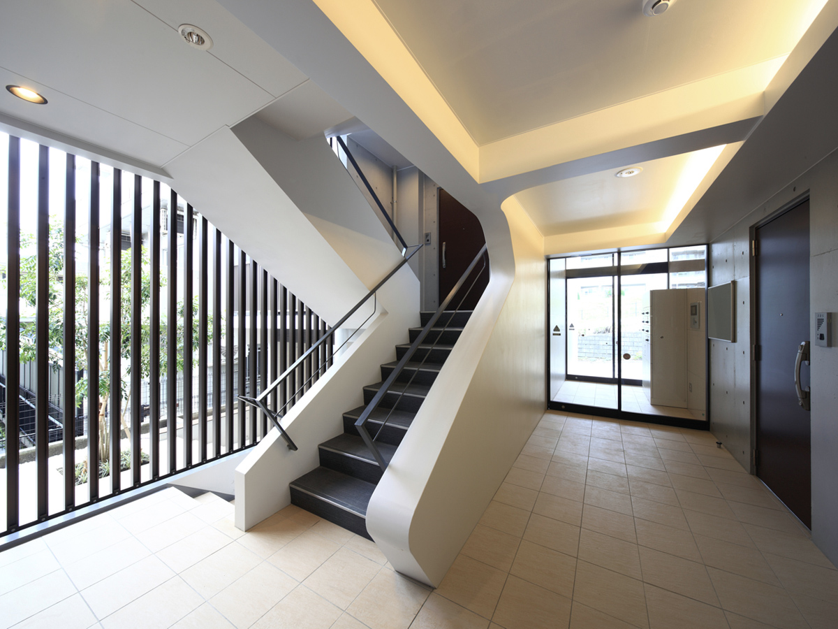敷地の高低差を利用して北側の住戸を半層上げたスキップフロアを採用した事で、エントランスに1層半の天井高を与え、ハイサッシのドアでこの高さを活かしている。