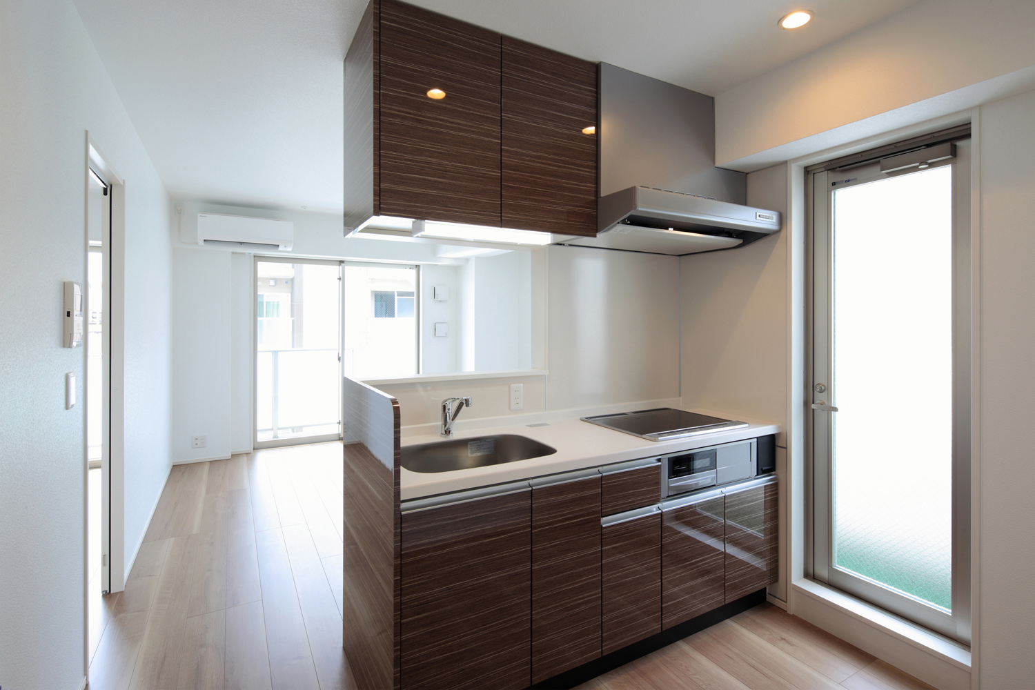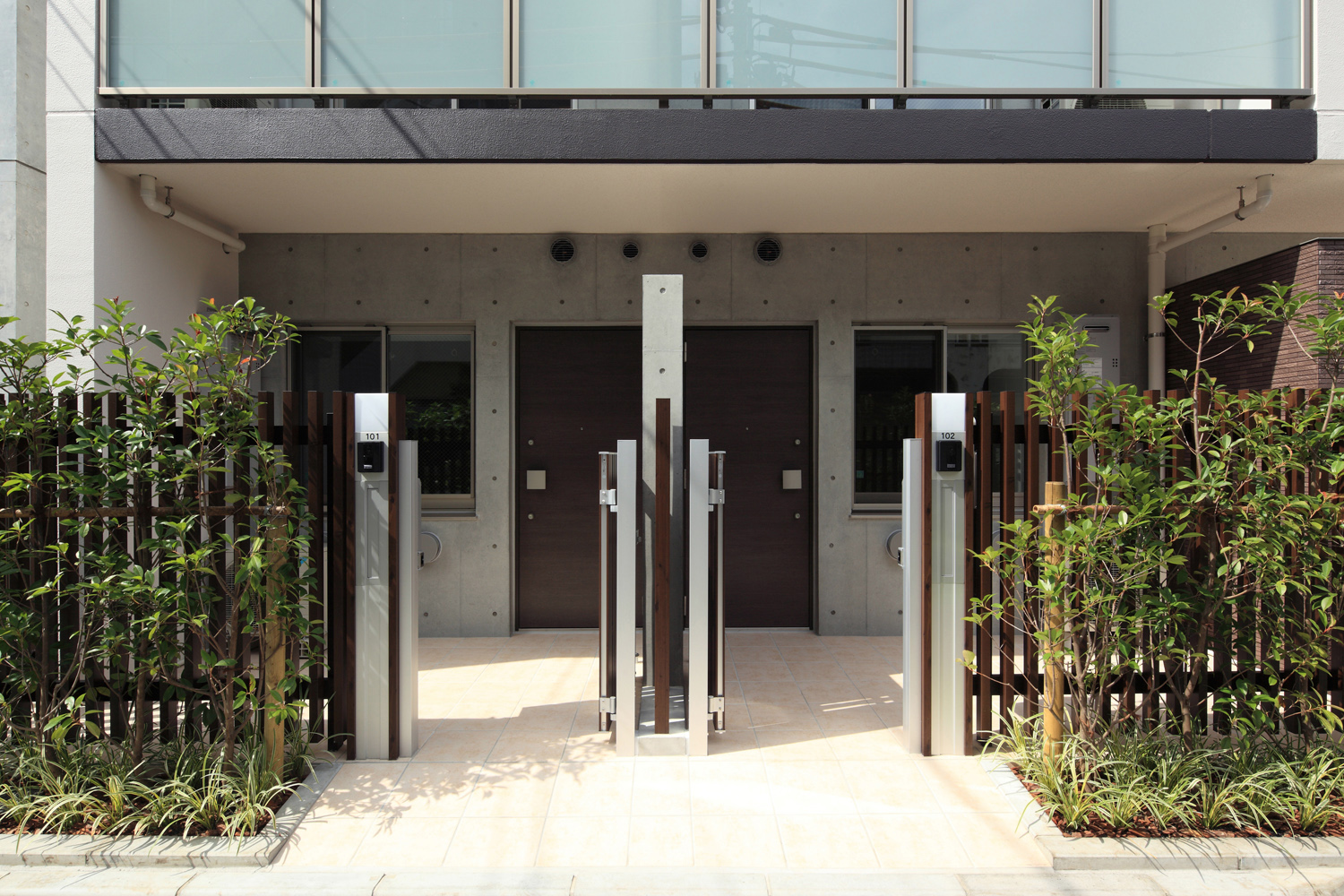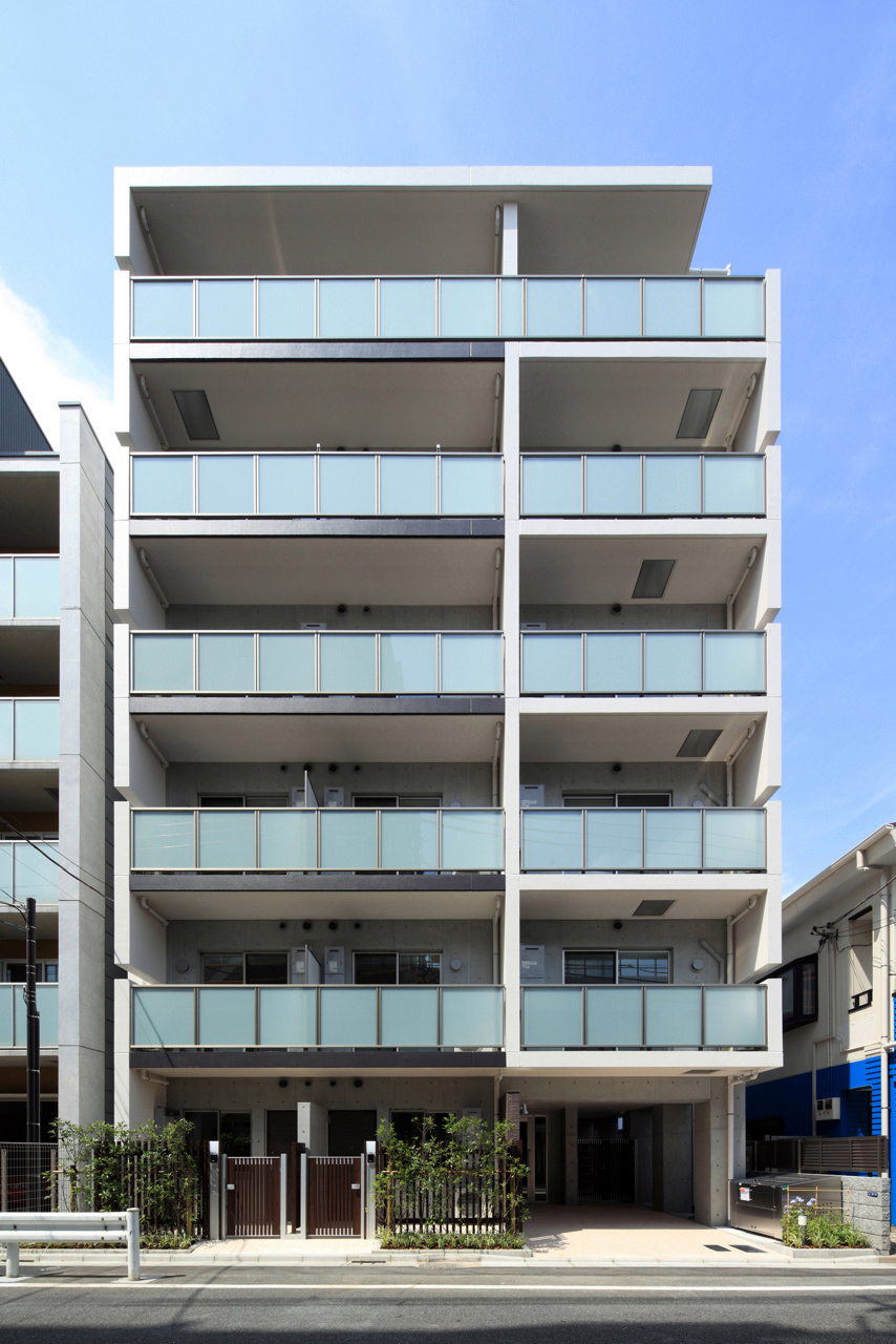南北に細長い敷地に計画した19戸の賃貸集合住宅。 街区の風の通りを考慮して、奥の建物の空地に繋がる様にピロティ形式のアプローチを設け、ボーダータイルの壁がエントランスを導く様に奥へと続く。 1階には道路側の専用庭から直接出入りするプランを採用し、2階以上は階数に応じて1R、1LDK、2LDKをレイアウトしている。