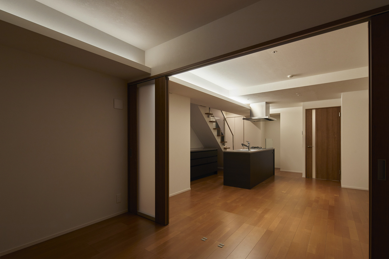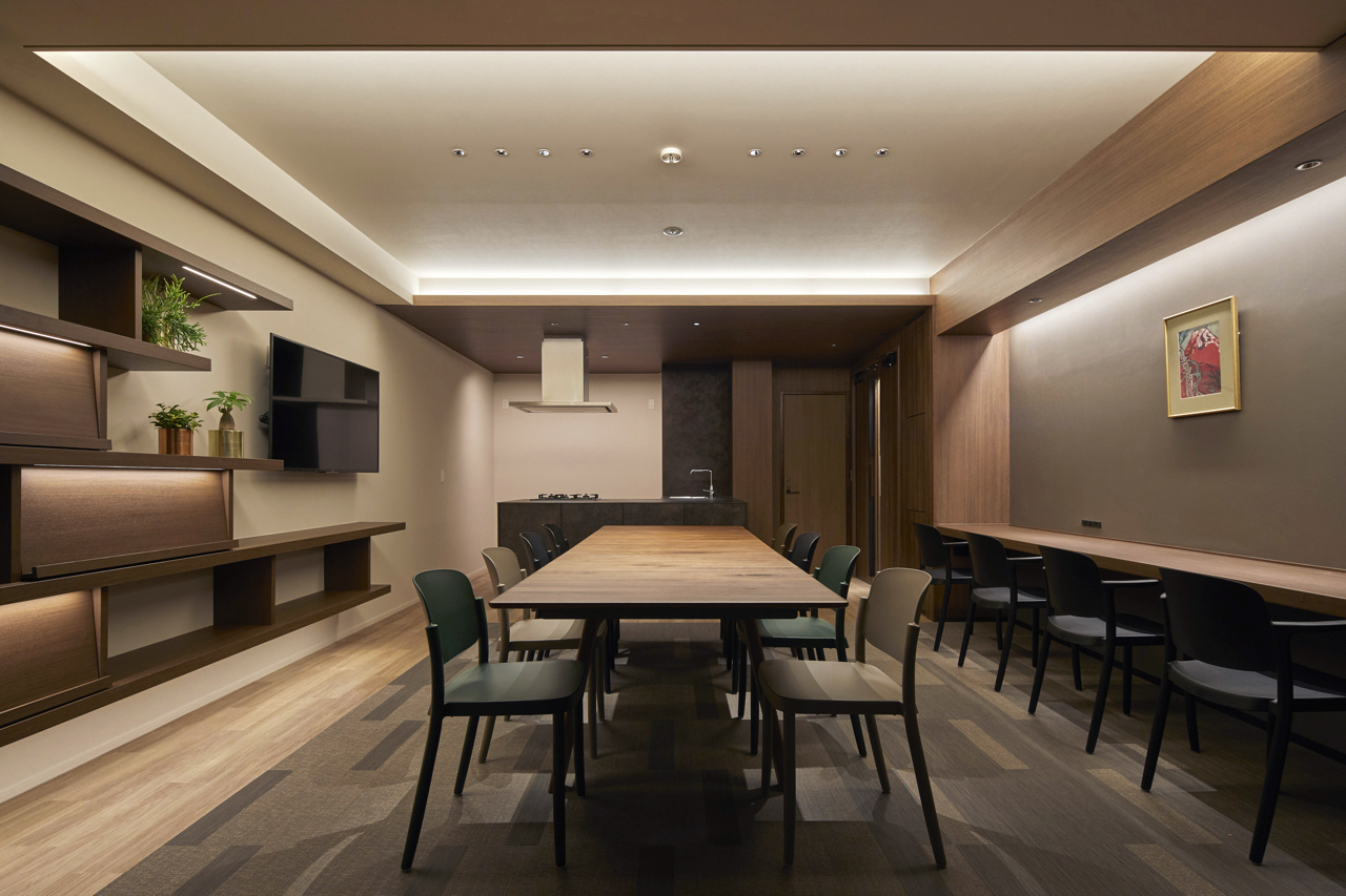 日影規制によって複雑な凹凸が生じた建物高さを整理し、垂直性の強い重層構成に至る。この大きさの異なる壁の聳り立つ有様に大仙院の石組のイメージが重なり、北側の建物正面に配される屋外階段を囲うルーバーを枯山水の滝に見立てた。8種類の形材を和柄の流水紋の滝縞を用いて組み合わせ、下方に向けて断面を細くすることで水の流れ落ちる様を描いている。