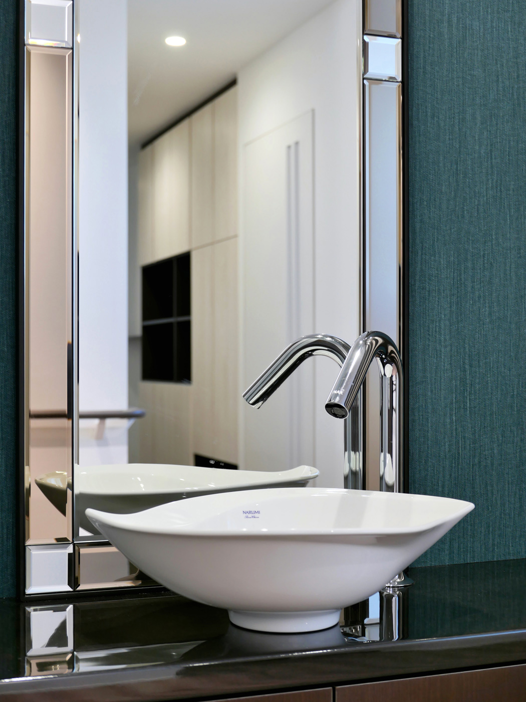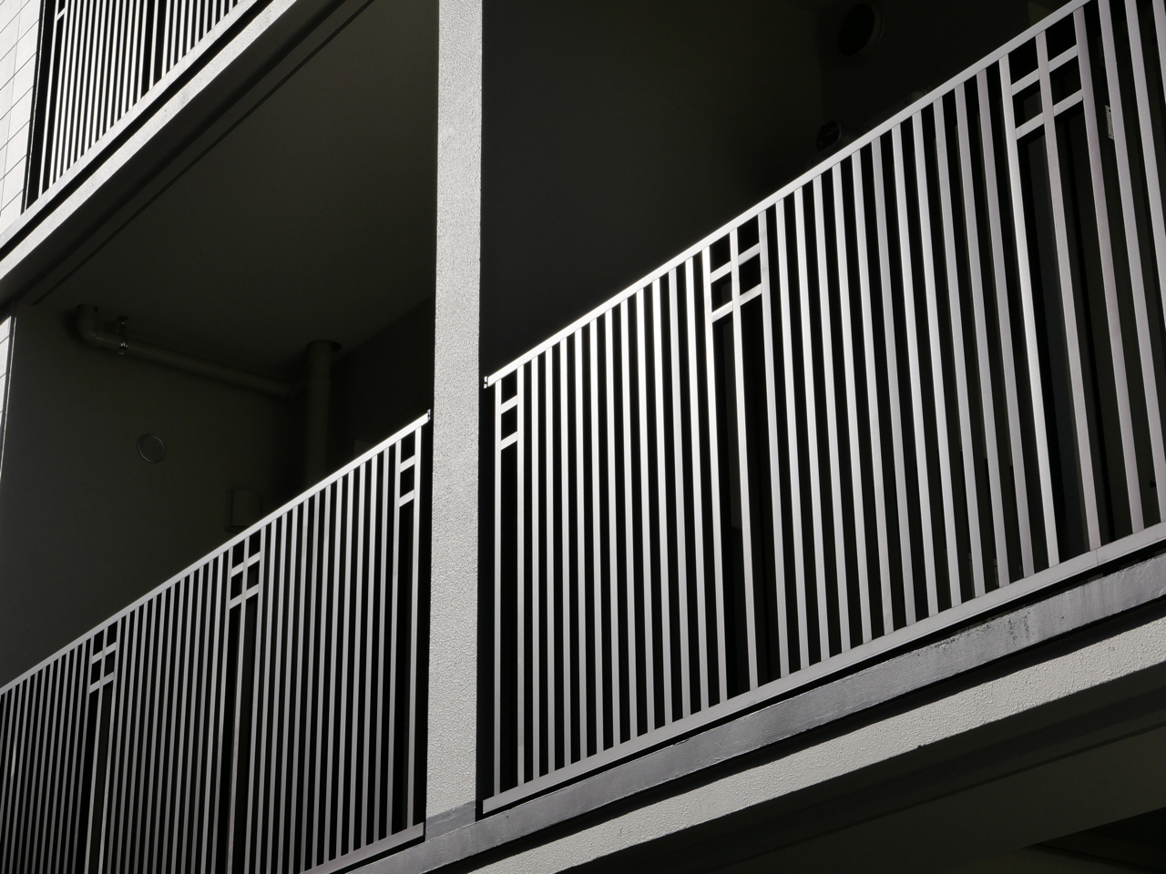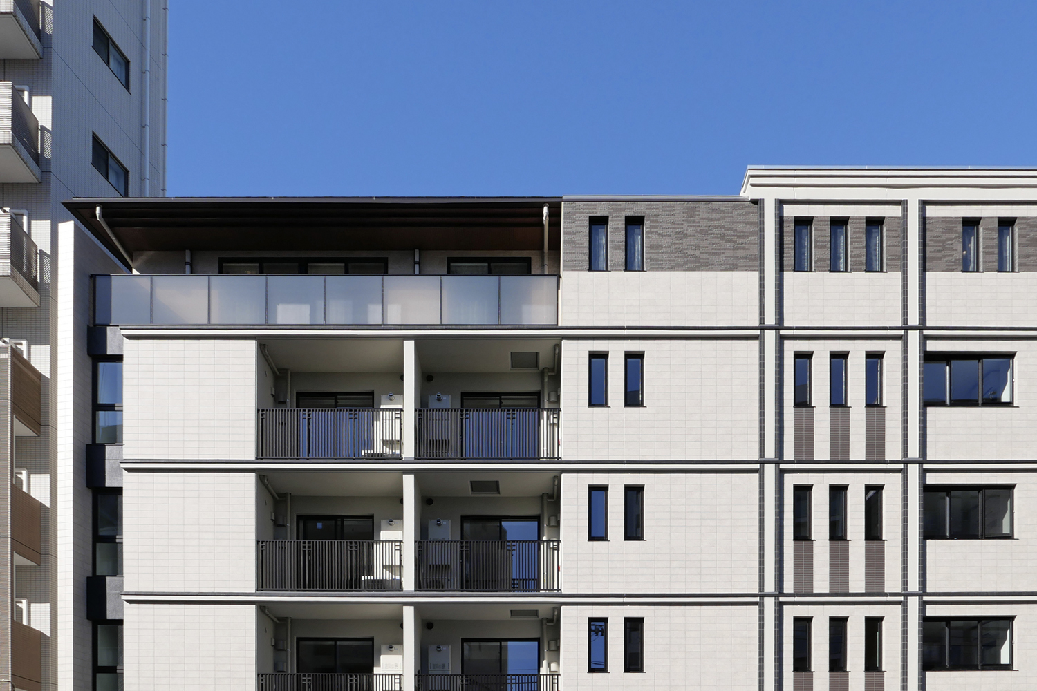 全長36m、妻面3mの特異なプロポーションであるが、各階に施した化粧水切による水平分割で建物全体の統一感を図り、三連窓や柱型、縦格子手摺でアール・デコ様式のような垂直性の表現を加え、外観のデザインを纏め上げた。