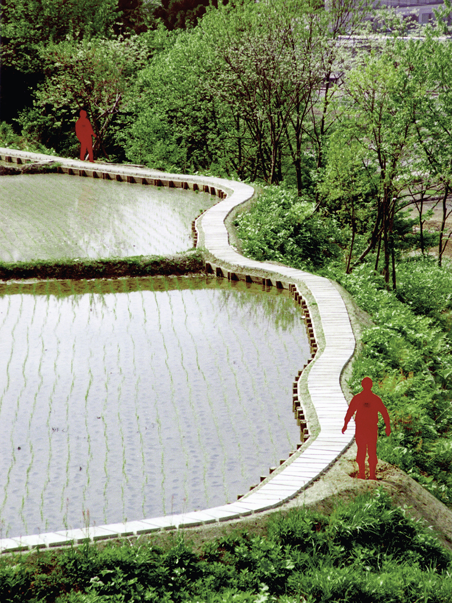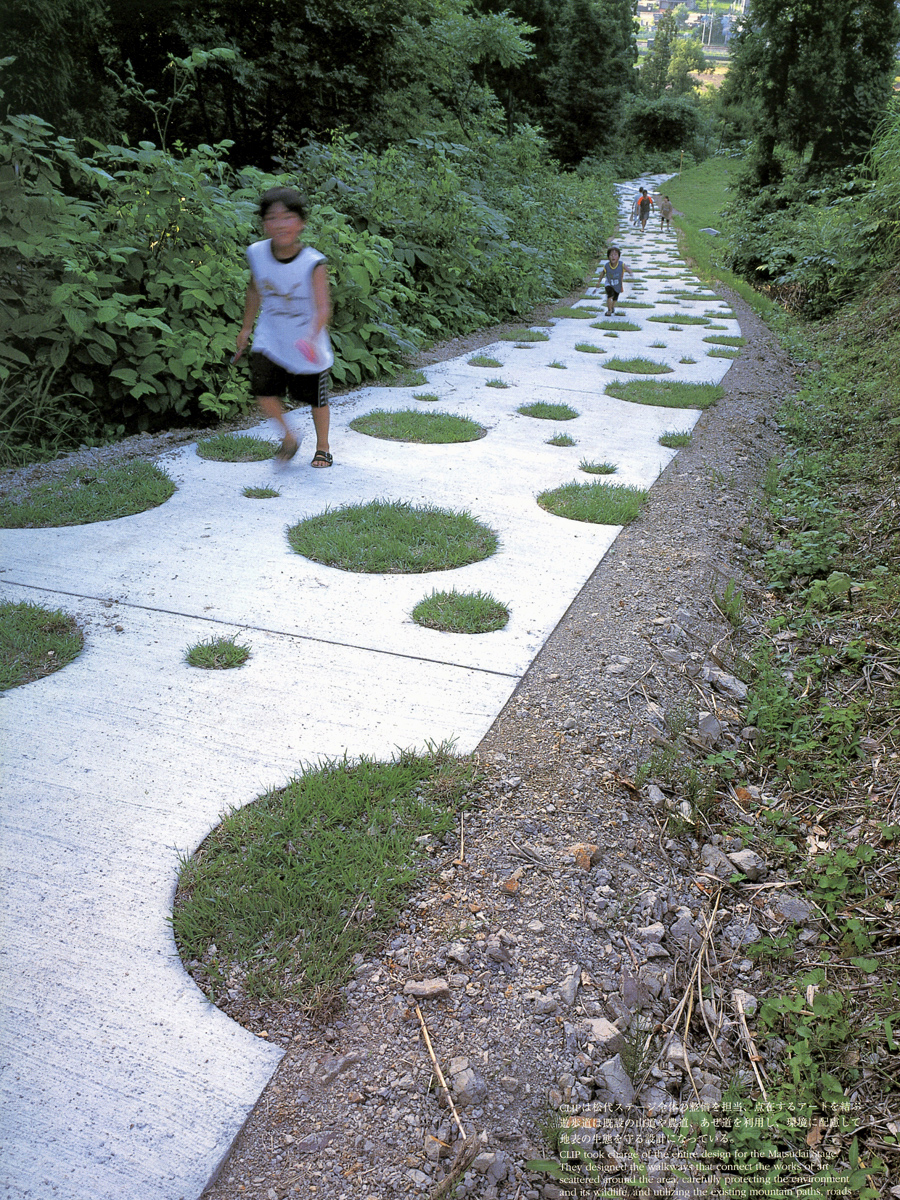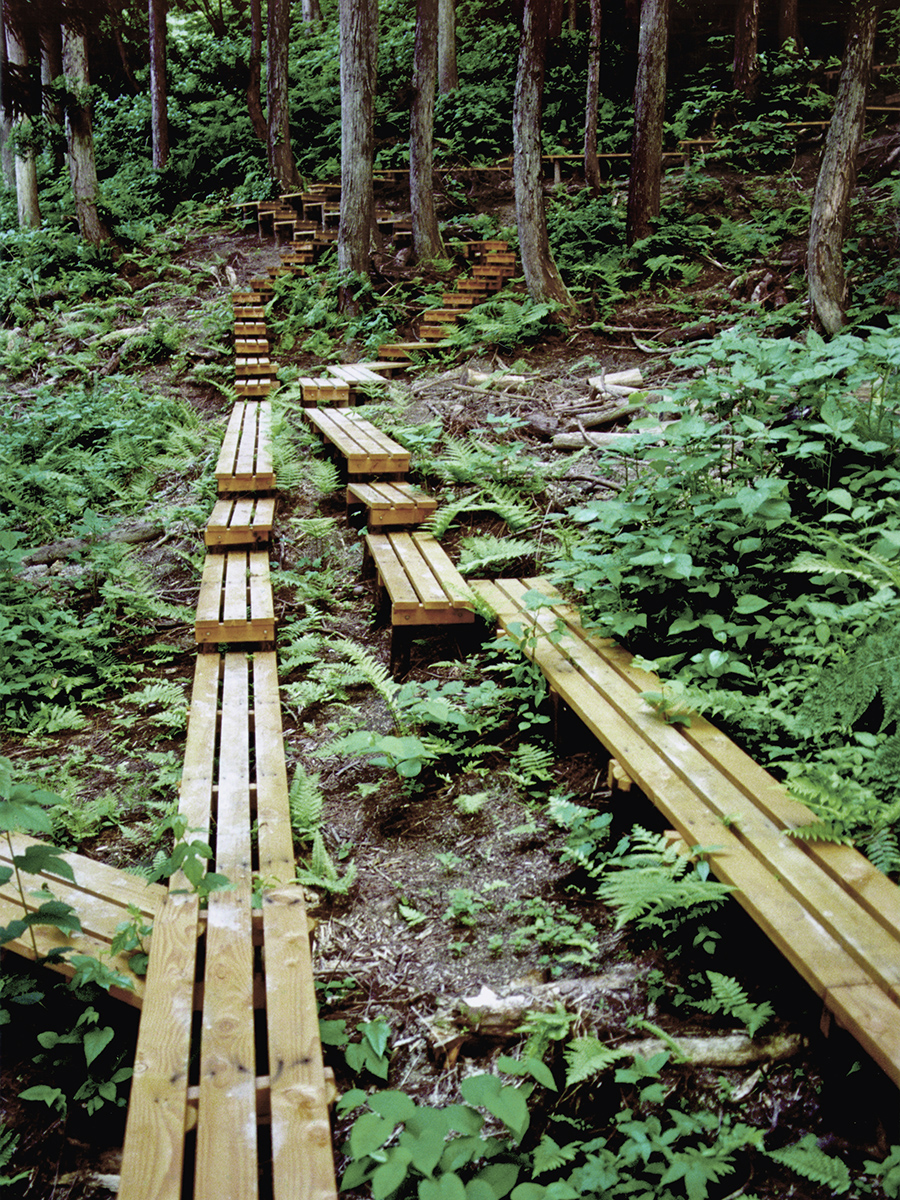 実り豊かな里山に点在するアート作品を結ぶ遊歩道は、季節の山道や農道、あぜ道を利用し、環境に配慮して地表の生態を守る設計が求められました。